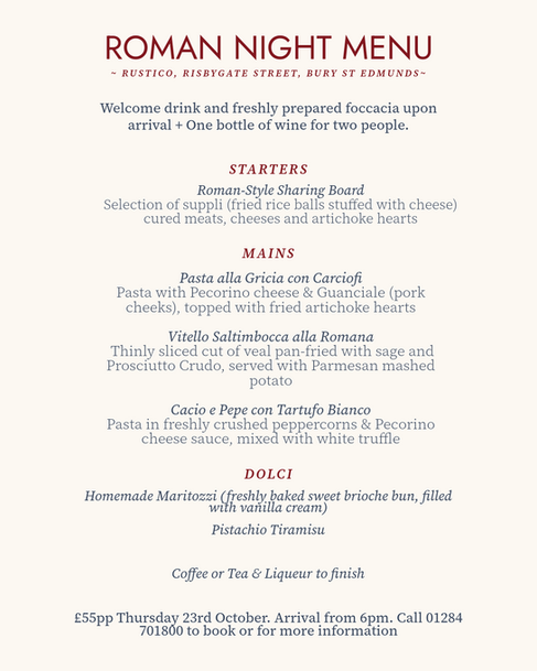 Join us at Rustico Bury St Edmunds for a special regional Roman Night on Thursday 23rd October - an evening of authentic Roman flavours & wine in the heart of town.